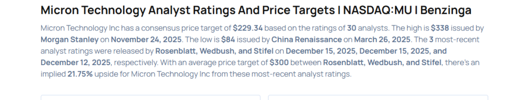 - Wedbush boosted the price target for Micron Technology Inc (NASDAQ:MU) from $220 to $300. Wedbush analyst Matt Bryson maintained an Outperform rating. Micron shares closed at $241.14 on Friday. See how other analysts view this stock.