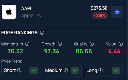 Benzinga Edge stock rankings show Apple maintains a positive outlook across the short, medium and long-term time frames, with more detailed performance data available here.