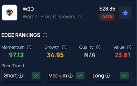 According to Benzinga’s Edge Stock Rankings, WBD shows a strong price trend across short, medium and long-term periods. More performance insights can be found here.