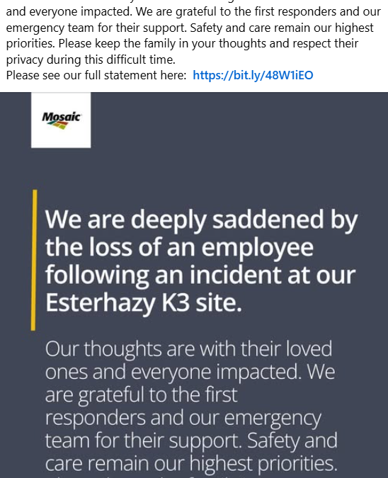 “Our thoughts go out to our colleague’s family and friends, all employees, and the broader community,” Mosaic stated.