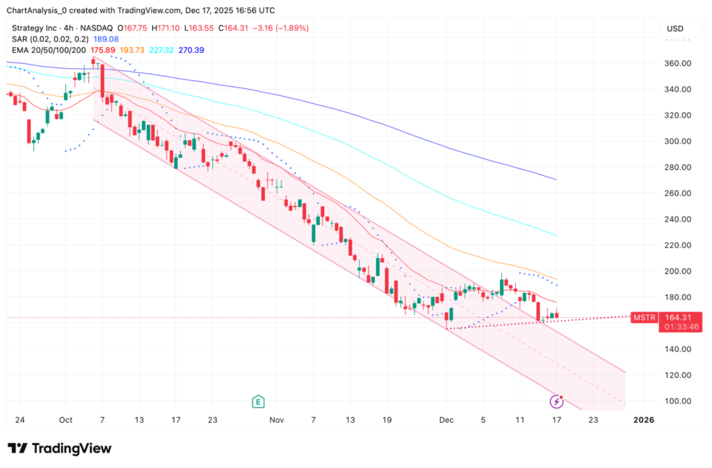 MSTR remains locked inside a well-defined descending channel on the 4-hour chart.
