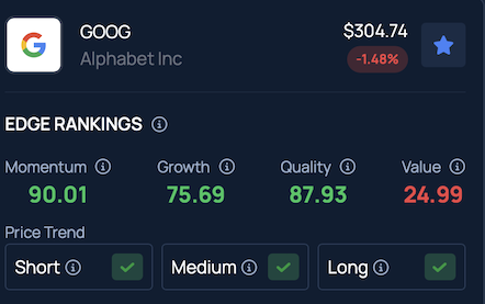 GOOG is also demonstrating a strong price trend across the short, medium and long-term time frames. For more detailed insights, visit Benzinga Edge Stock Rankings.
