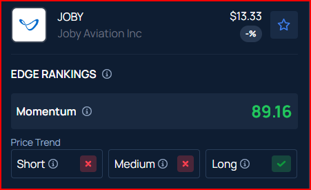 Benzinga’s Edge Rankings place Joby Aviation in the 89th percentile for momentum, and it had a stronger price trend over the long term but a weaker trend over the medium and short term. Check the detailed report here