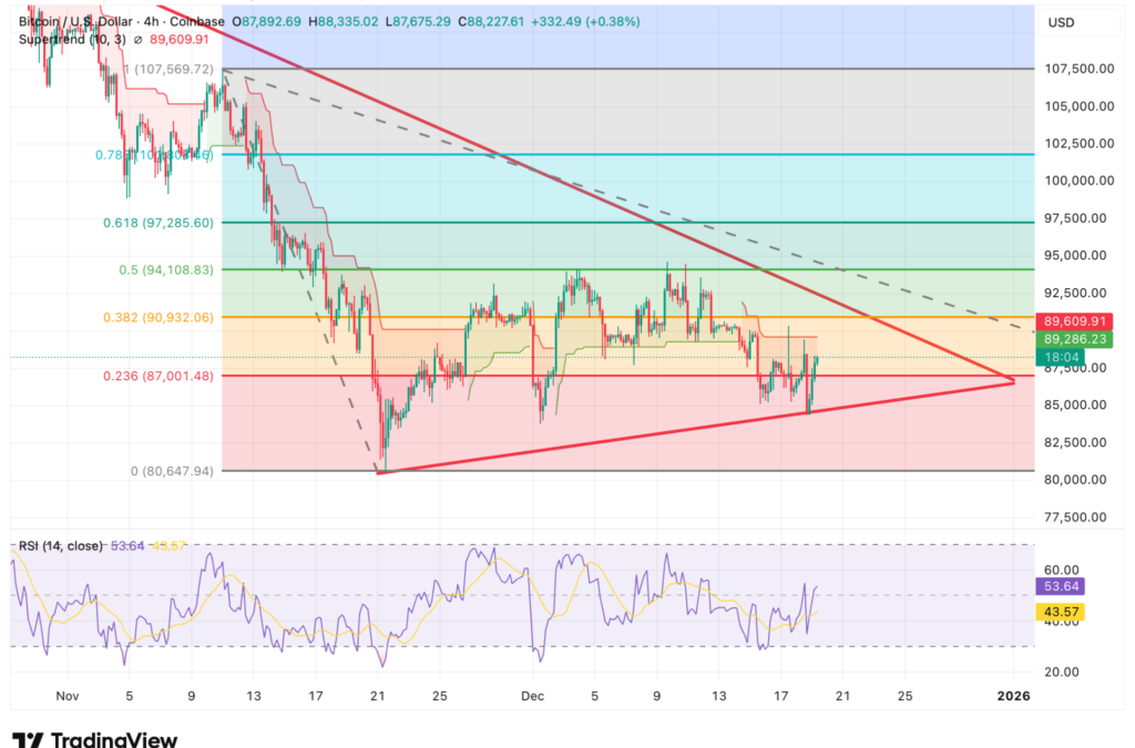 The $87,000 to $88,000 zone remains a key balance area, aligning with the 0.236 Fibonacci retracement.