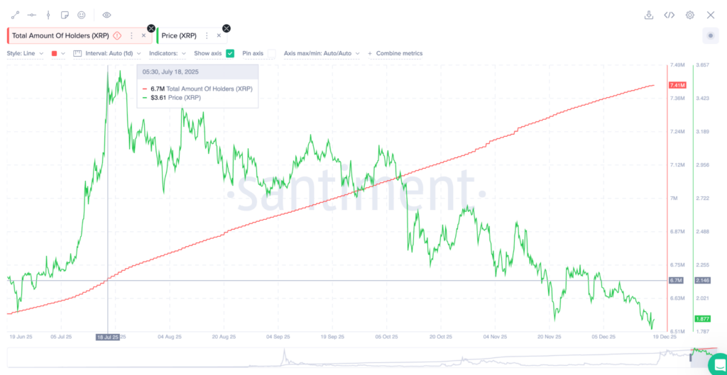Santiment data shows XRP Ledger participation continuing to rise even as XRP price has sharply underperformed since its July peak.
