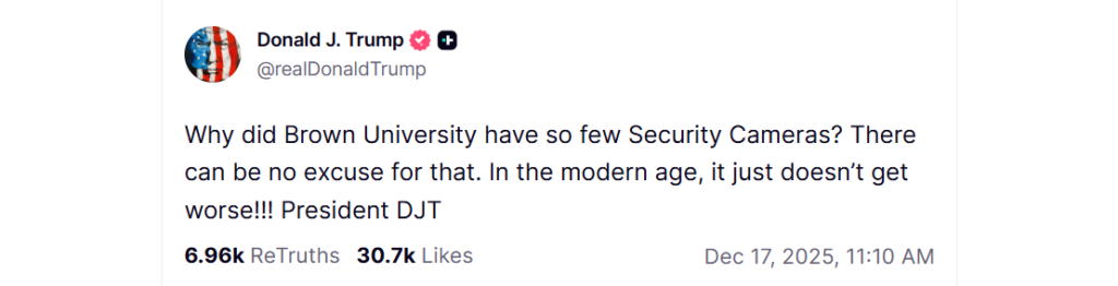 On Truth Social, Trump wrote, “Why did Brown University have so few Security Cameras?” adding, “There can be no excuse for that. In the modern age, it just doesn’t get worse!!!”
