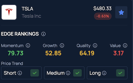 Benzinga Edge Rankings show Tesla in the 79th percentile for Momentum, with additional performance comparisons available against peers such as GM, Ford and Uber.