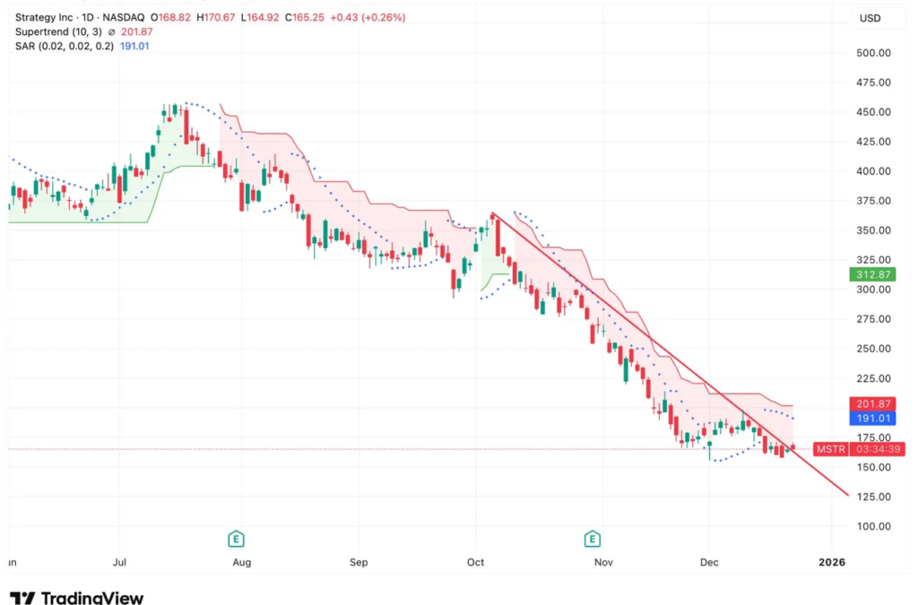 The Supertrend indicator sits at $201.87, well above current price, while SAR dots at $191.01 reinforce bearish structure.
