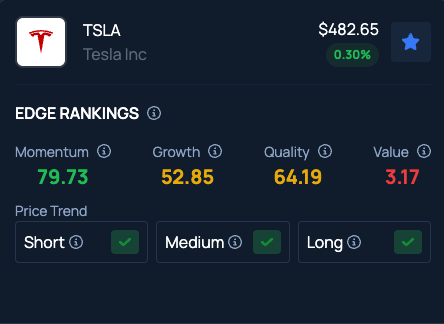 Benzinga Edge Stock Rankings indicate Tesla has a Momentum in the 79th percentile. Here is how it ranks against other EV players like Rivian.