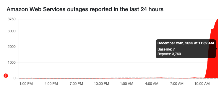 In a post on X, The Kobeissi Letter said “Amazon Web Services has crashed with tens of thousands of websites currently down,” adding that it was the “3rd large-scale crash in Amazon Web Services this year.” The tweet included a chart showing AWS outage reports spiking sharply over the prior 24 hours, underscoring the sudden and severe nature of the incident.