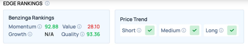 Alphabet scores well on the Momentum and Quality metrics, but offers poor Value. It also has a favorable price trend in the Short, Medium, and Long term. For more such insights, sign up for Benzinga Edge Stock Rankings today!