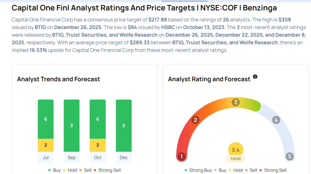 • BTIG raised the price target for Capital One Financial Corporation (NYSE:COF) from $264 to $308. BTIG analyst Vincent Caintic maintained a Buy rating. Capital One Financial shares closed at $248.27 on Wednesday. See how other analysts view this stock.