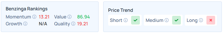 • It maintains a stronger price trend over the short and medium terms but a weak trend in the long term, with a poor quality ranking. Additional performance details, as per Benzinga’s Edge Stock Rankings, are available here.