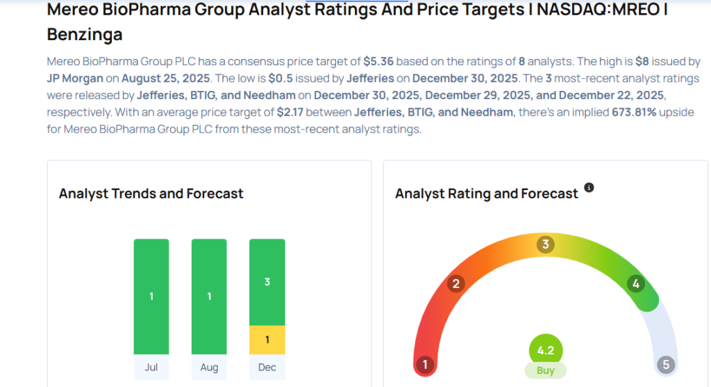- Jefferies analyst Maury Raycroft downgraded Mereo BioPharma Group plc (NASDAQ:MREO) from Buy to Hold and cut the price target from $7 to $0.5. Mereo BioPharma shares closed at $0.2854 on Monday. See how other analysts view this stock.