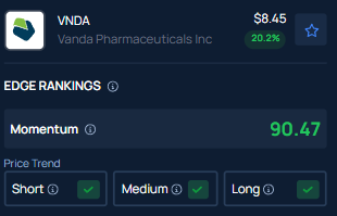 With a strong Momentum in the 90th percentile, Benzinga’s Edge Stock Rankings indicate that VNDA has a positive price trend across all time frames. Know how its momentum lines up with other well-known names.