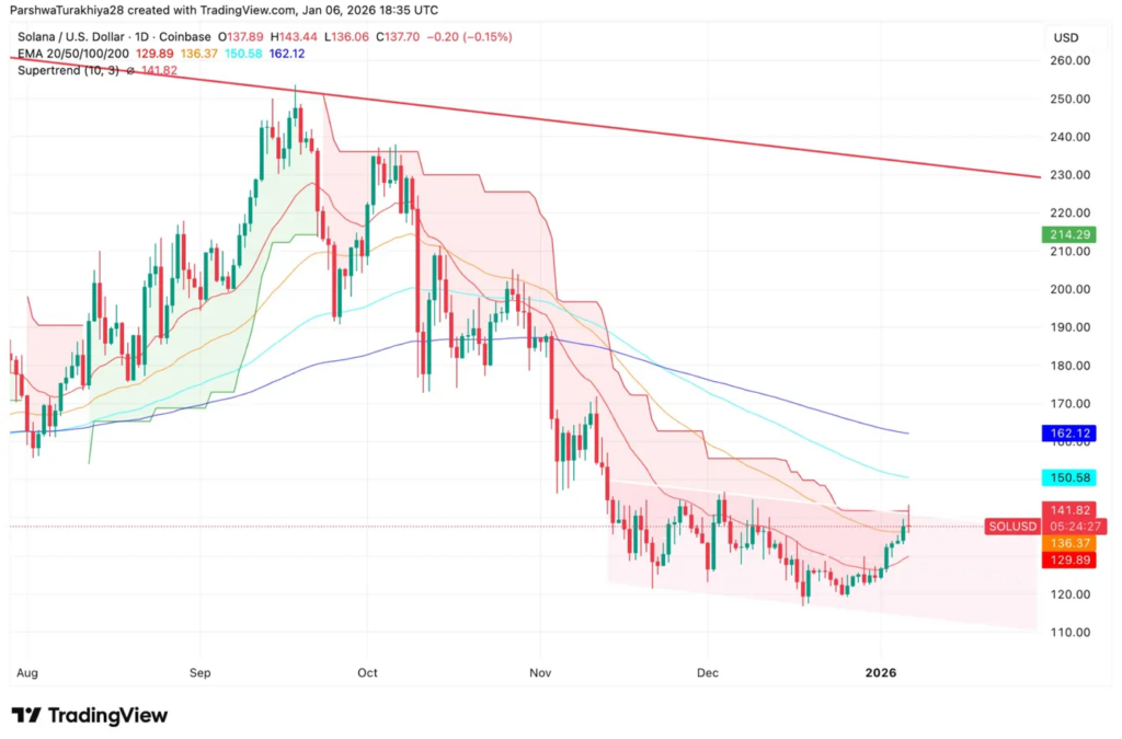 The chart shows SOL stuck below the Supertrend indicator at $141.82 and unable to break the 100 and 200 EMAs.