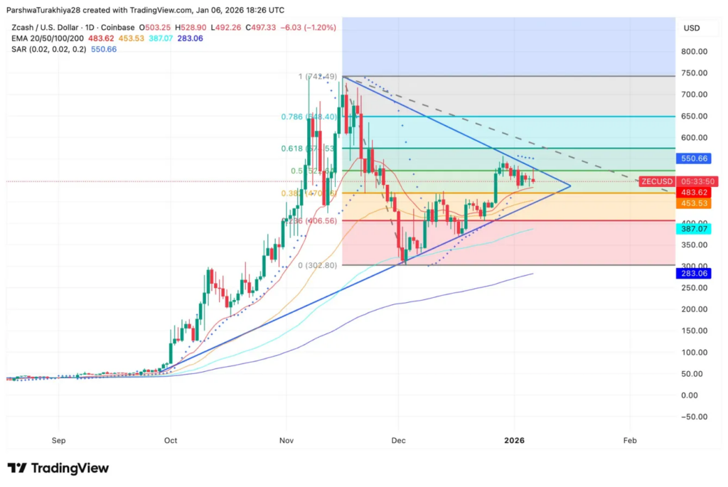 ZEC is trading between the 0.382 Fibonacci at $476 and 0.5 level at $522, with all major EMAs compressing tightly.