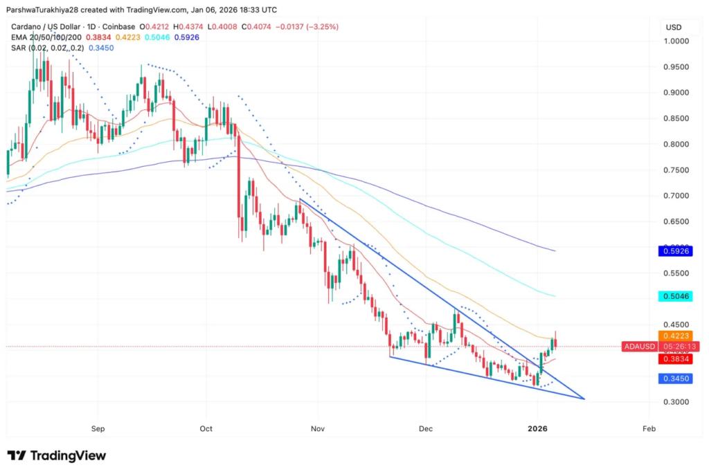 ADA bounced off support near $0.38 but needs to break above $0.42-$0.45 and reclaim the 50 EMA to even hint at a reversal.