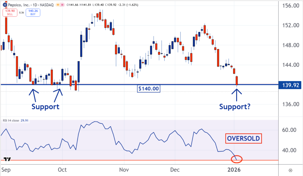But now, Pepsi is at support and oversold. These conditions could set the stage for a reversal and move higher. This is why Pepsi is the Stock of the Day.