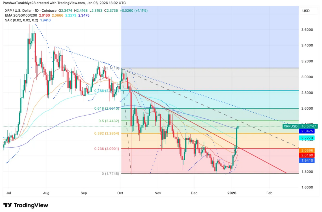 The chart shows XRP reclaimed the 100 EMA at $2.2273 and is now testing the 200 EMA at $2.3475.