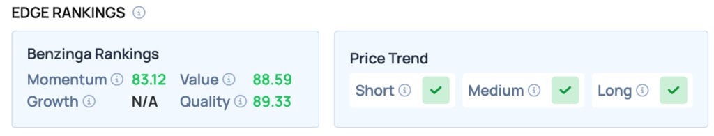Ford scores well on the Momentum, Quality and Value metrics. It also has a favorable price trend in the Short, Medium, and Long term. For more such insights, sign up for Benzinga Edge Stock Rankings today!