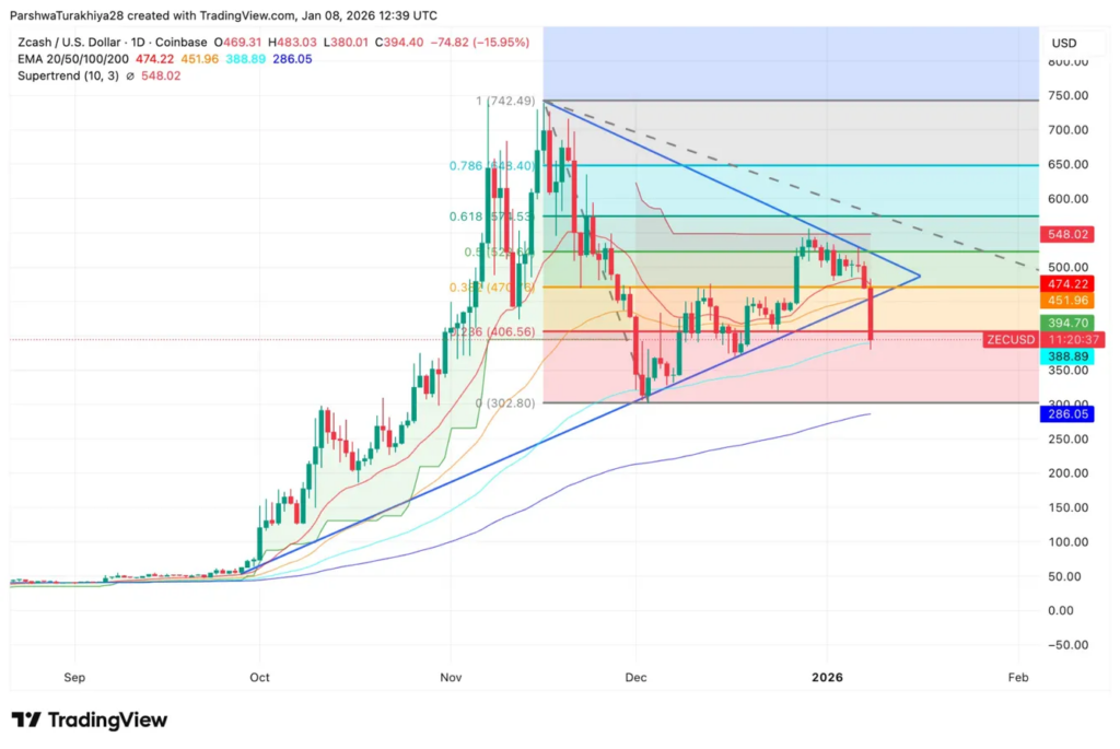 After peaking at $548 on Jan. 3—representing a 30% rally from the December low—ZEC gave back the entire gain in just five days, breaking decisively below the triangle’s lower boundary and the critical 0.236 Fibonacci support at $406.56.