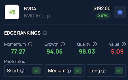 Benzinga Edge Stock Rankings place Nvidia in the 94th percentile for Growth and the 98th percentile for Quality, highlighting its standout performance compared to companies like Tesla and others.
