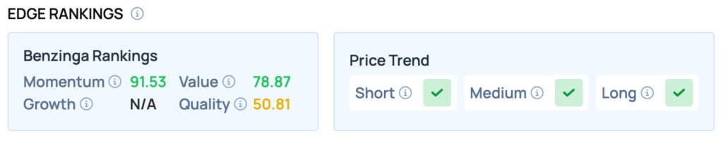 GM offers good Momentum and Value and scores satisfactorily on the Quality metric. GM also offers a favorable price trend in the Medium and Long term. For more such insights, sign up for Benzinga Edge Stock Rankings today!