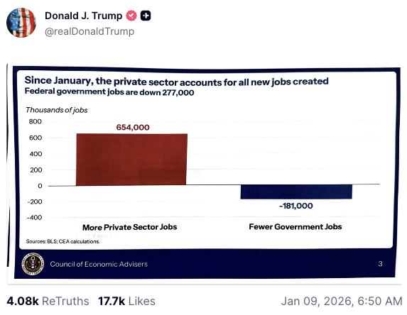 The chart Trump posted on Truth Social shows total private-sector job creation in 2025 at 654,000, while highlighting that overall government employment declined by 181,000, which can be attributed to the cuts made by the Department of Government Efficiency or D.O.G.E., led by Tesla Inc. (NASDAQ:TSLA) CEO, Elon Musk.