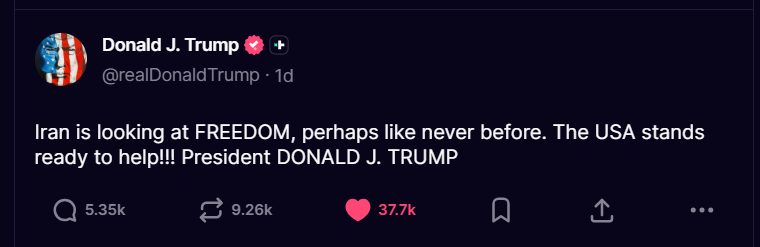 Moreover, Trump said via his Truth Social that “Iran is looking at Freedom,” and the U.S. stands ready to help.