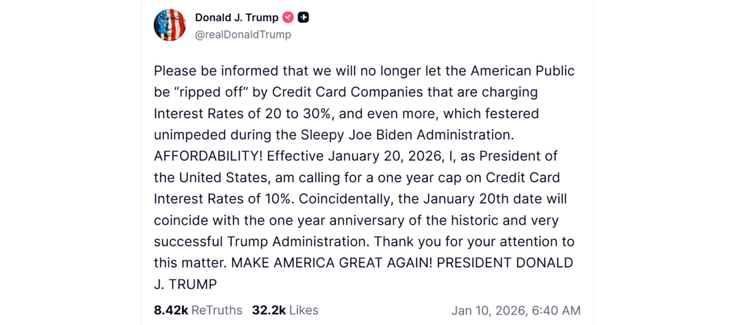 The exchange came days after Trump called for credit card companies to cap interest rates at 10% for a year. In a Friday post on Truth Social, he wrote, “Please be informed that we will no longer let the American Public be ‘ripped off’ by Credit Card Companies that are charging Interest Rates of 20 to 30%, and even more, which festered unimpeded during the Sleepy Joe Biden Administration. AFFORDABILITY!”