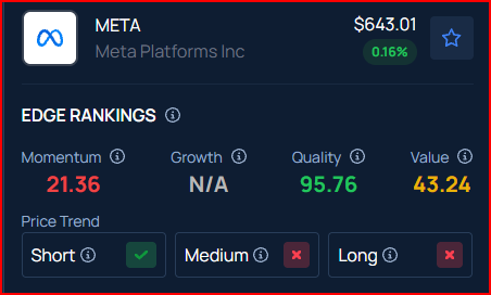 Meta holds a momentum rating of 21.36% and a quality rating of 95.76%, according to Benzinga’s Proprietary Edge Rankings. Click here to see how it compares to other leading tech companies.