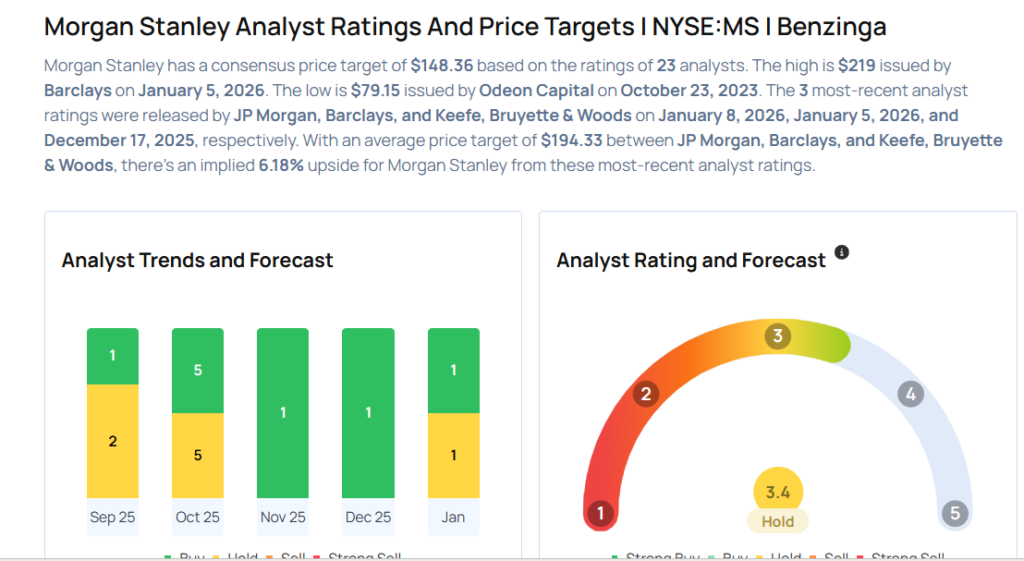 Analysts expect the bank to report fourth-quarter earnings of $2.45 per share. That’s up from $2.22 per share in the year-ago period. The consensus estimate for Morgan Stanley’s quarterly revenue is $17.75 billion (it reported $16.22 billion last year), according to Benzinga Pro.