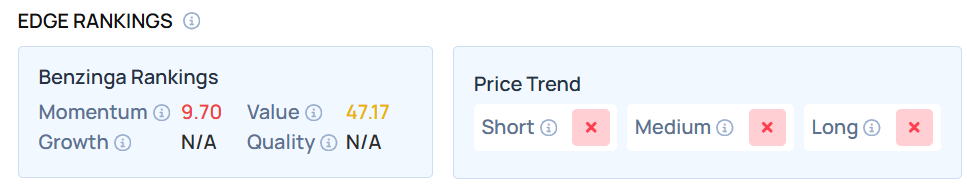The stock maintains a weaker price trend over the short, medium, and long terms with a poor Momentum ranking, according to Benzinga’s Edge Stock Rankings.