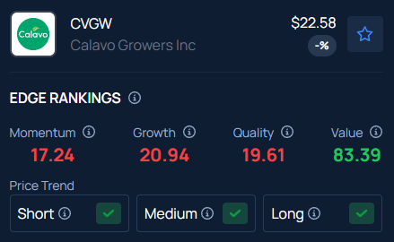 Benzinga’s Edge Stock Rankings indicate CVGW has a Value score of 83.39.