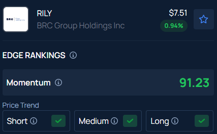 Benzinga’s Edge Stock Rankings show that BRC Group Holdings Inc. (RILY) has strong momentum in the 91st percentile, indicating a positive price trend across all time frames.