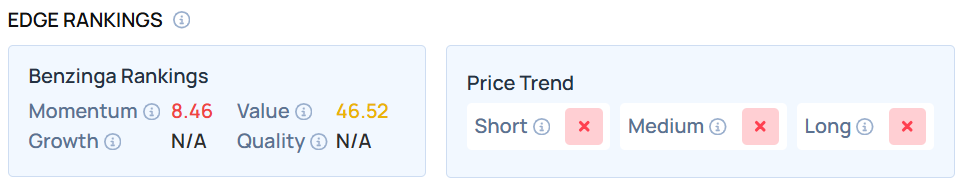 The stock maintains a weaker price trend over the short, medium, and long terms with a poor Momentum ranking, according to Benzinga’s Edge Stock Rankings.