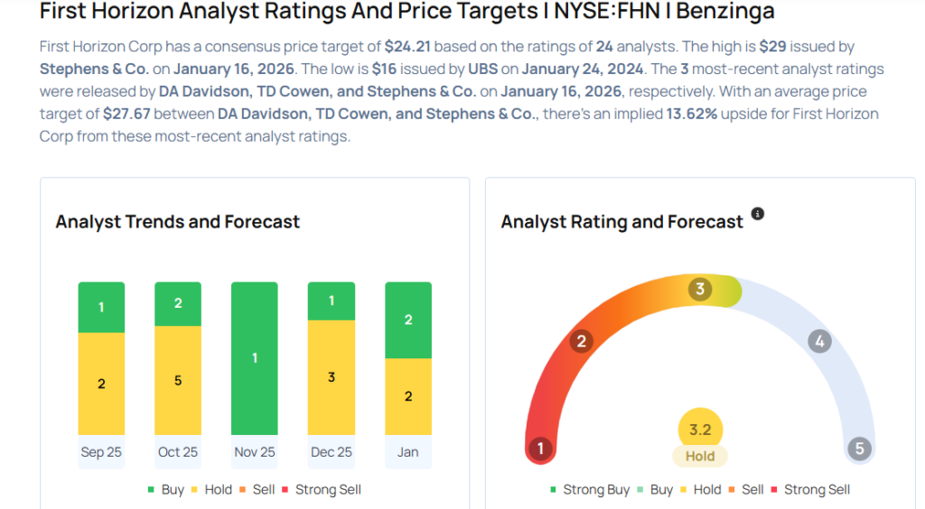 - TD Cowen analyst Janet Lee maintained First Horizon with a Hold and raised the price target from $26 to $27.