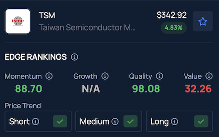 TSMC shows a stronger price trend across the short, medium and long terms, though it carries a weak Value rating, according to Benzinga’s Edge Stock Rankings.