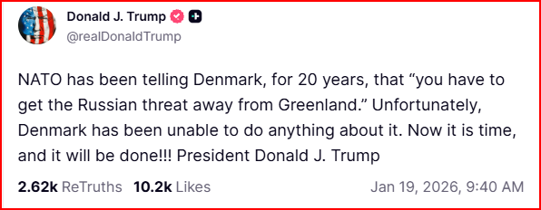 Meanwhile, on Sunday, Trump stated that Denmark hasn’t been successful in getting the “Russian threat” away from the region for 20 years. He warned that, “Now it is time, and it will be done!!!”