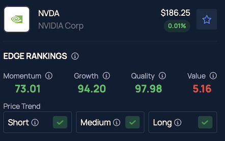 Nvidia stock scores low on Value in Benzinga’s Edge Stock Rankings, with a favorable price trend in the short, medium and long terms.