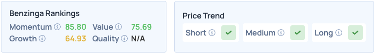 The stock scores high on Momentum and Value in Benzinga’s Edge Stock Rankings, with a favorable price trend in the short, medium and long terms.
