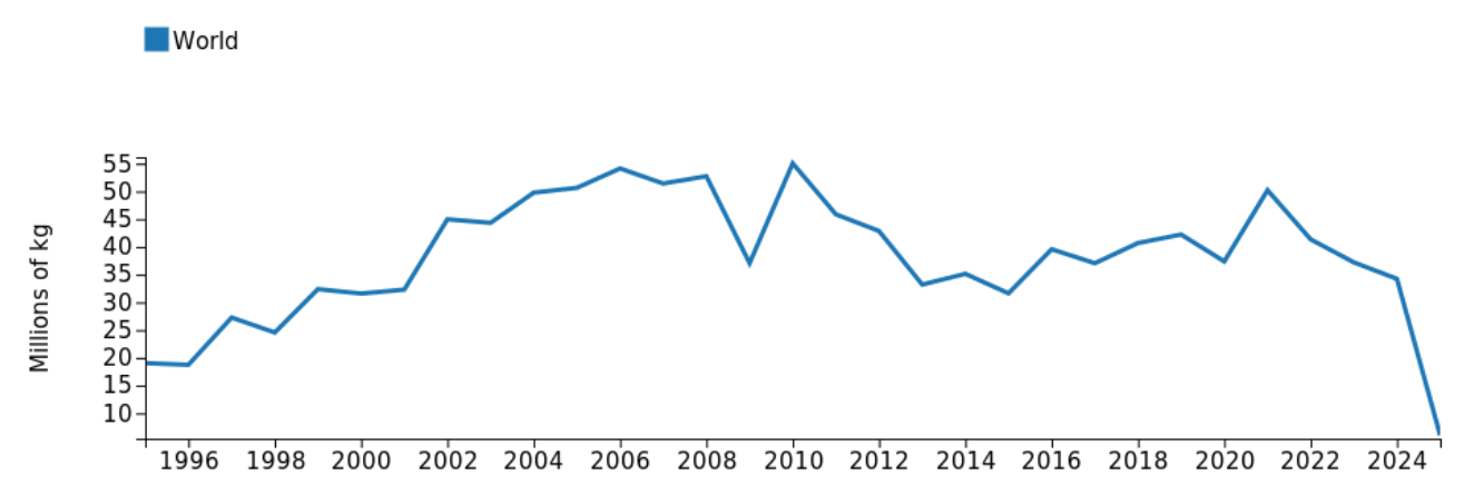 Chinese antimony exports, 1995-2025, source: Export Planning Information System, via Pricepedia.