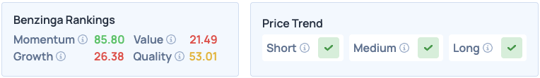 Shares of Johnson & Johnson were down 0.41% on Friday, closing at $218.66, and are down 0.70% overnight. The stock scores high on Momentum in Benzinga’s Edge Stock Rankings, with a favorable price trend in the short, medium and long terms.