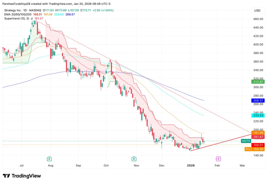The higher lows since December suggest selling pressure may be exhausting, but MSTR needs to reclaim $181 and break the Supertrend to confirm a trend change.
