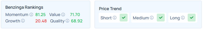 - It maintains a stronger price trend over the short, medium, and long term with a strong value ranking, as per Benzinga’s Edge Stock Rankings.