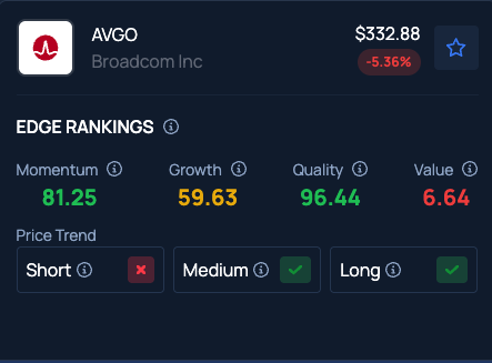 Benzinga Edge Stock Rankings show Broadcom stock has a Value in the 6th percentile and checks out on the Medium and Long Price Trends.