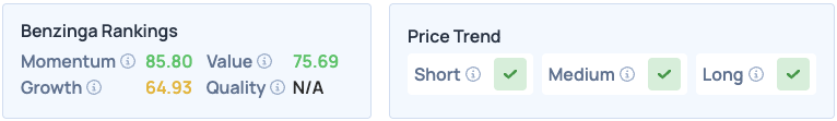 Ryanair shares were up 1.79% on Tuesday, closing at $69.50 and are up 3.44% overnight. The stock scores high on Momentum and Value in Benzinga’s Edge Stock Rankings, with a favorable price trend in the short, medium and long terms.