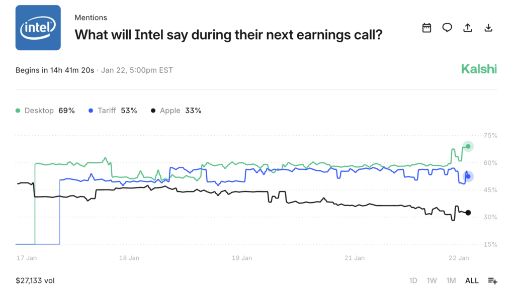 On Kalshi, a regulated prediction market, traders are placing bets on whether specific words will be mentioned during Intel’s upcoming earnings call, including the Q&A.