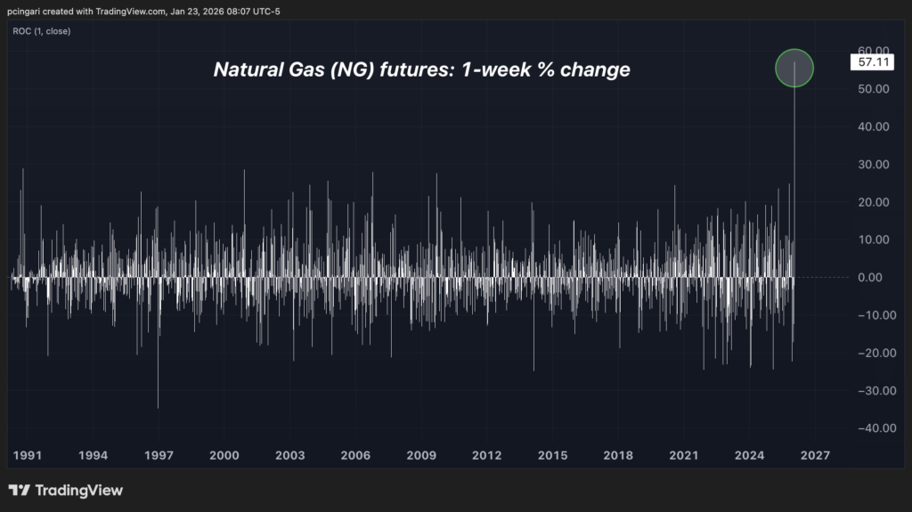 Equities tied to U.S. natural gas production are on track for robust weekly gains as prices surge. Antero Resources (NYSE:AR) is up roughly 9% on the week, while EQT Corporation has climbed about 10.5%.